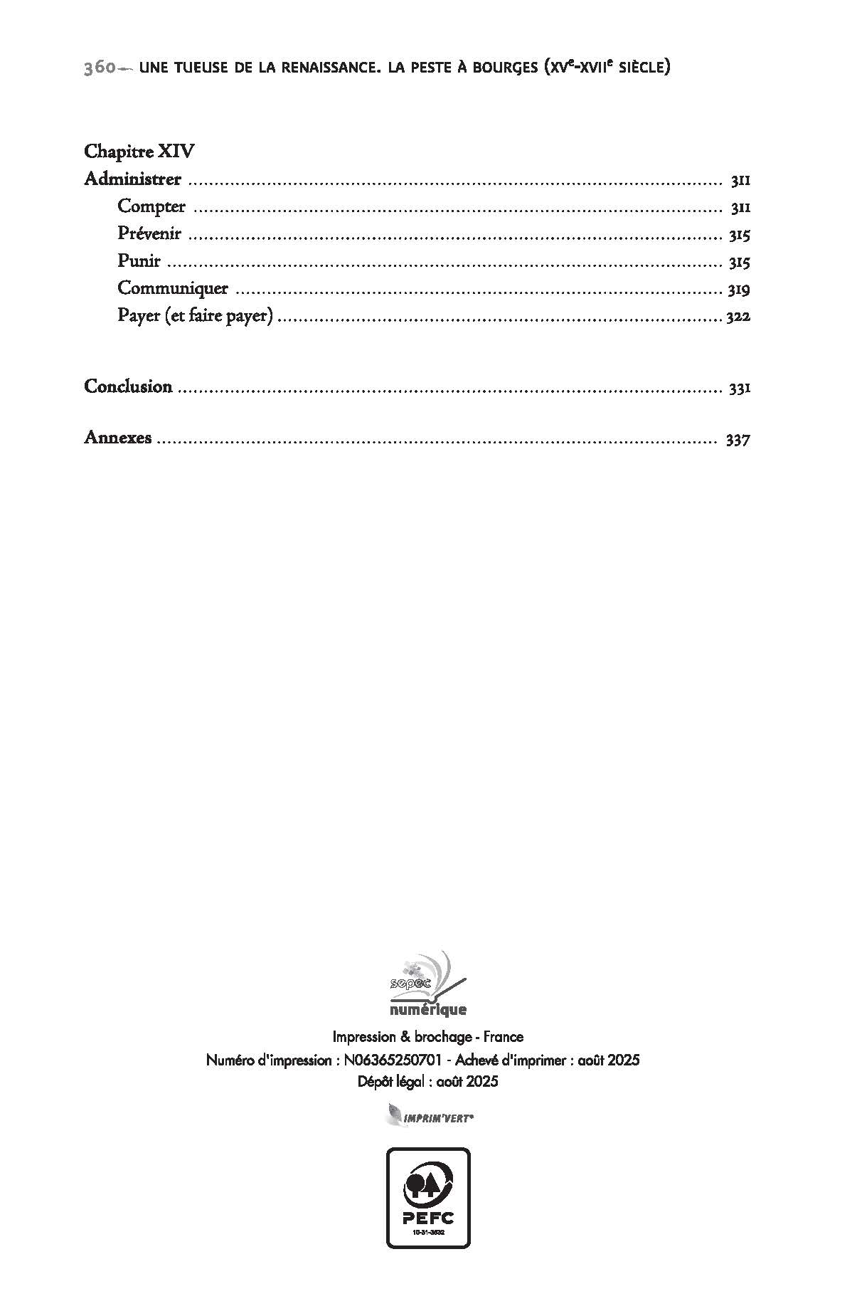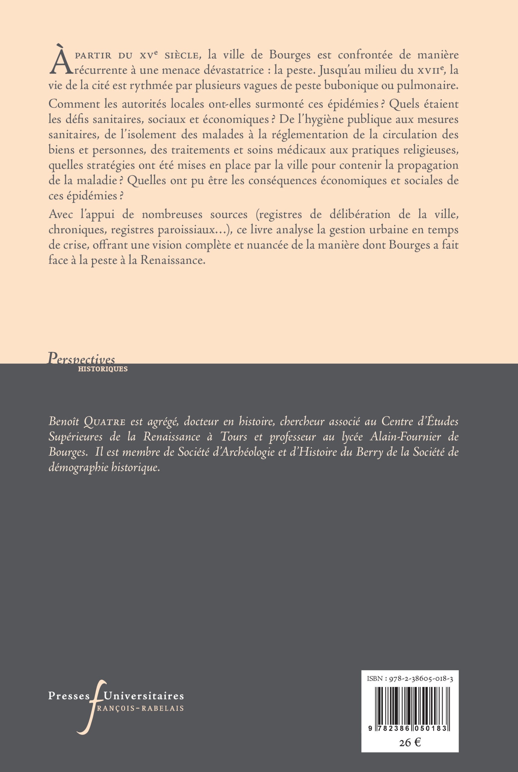 Avec l’appui de nombreuses sources (registres de délibération de la ville, chroniques, registres paroissiaux…), ce livre analyse la gestion urbaine en temps de crise, offrant une vision complète et nuancée de la manière dont Bourges a fait face à la peste à la Renaissance.
